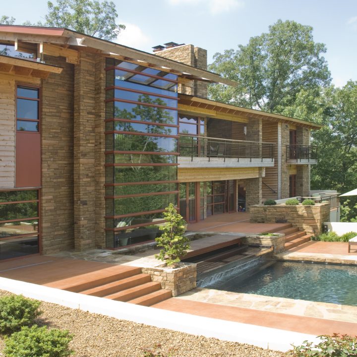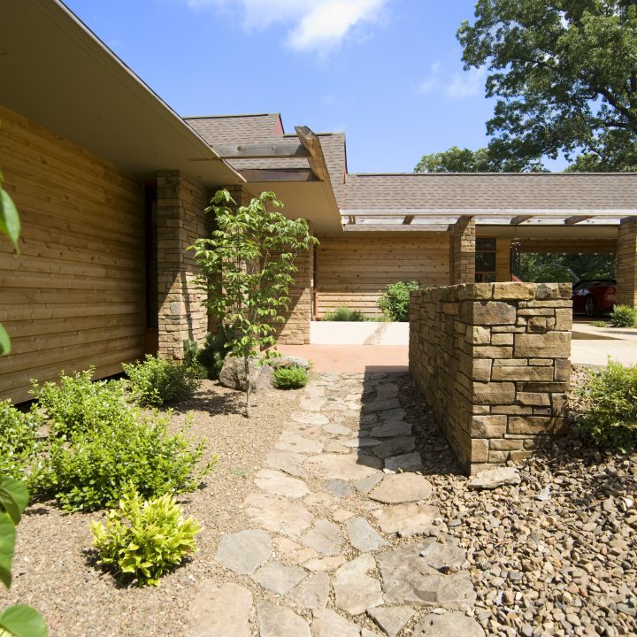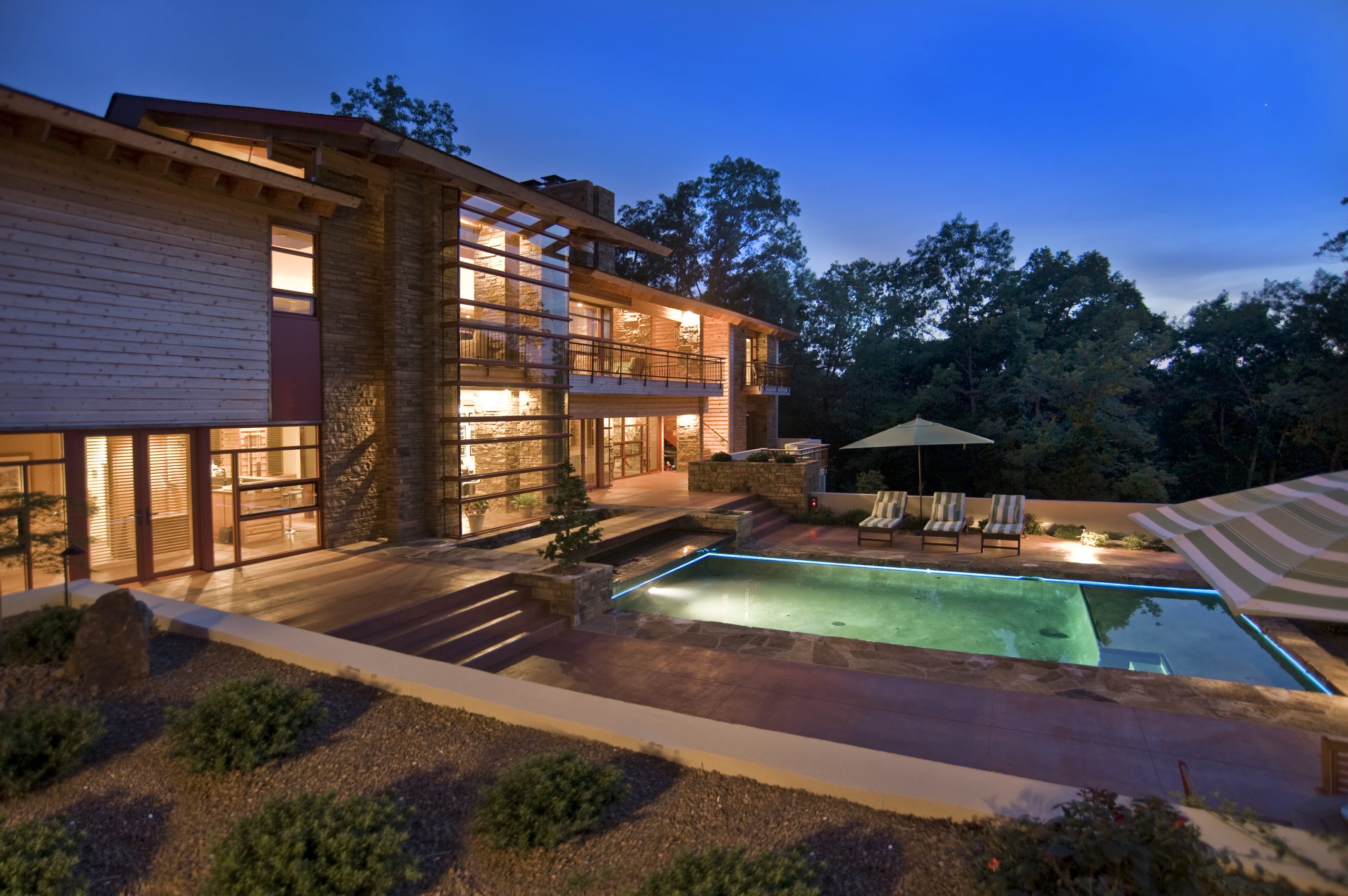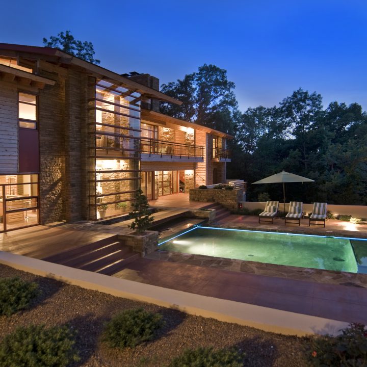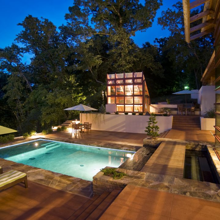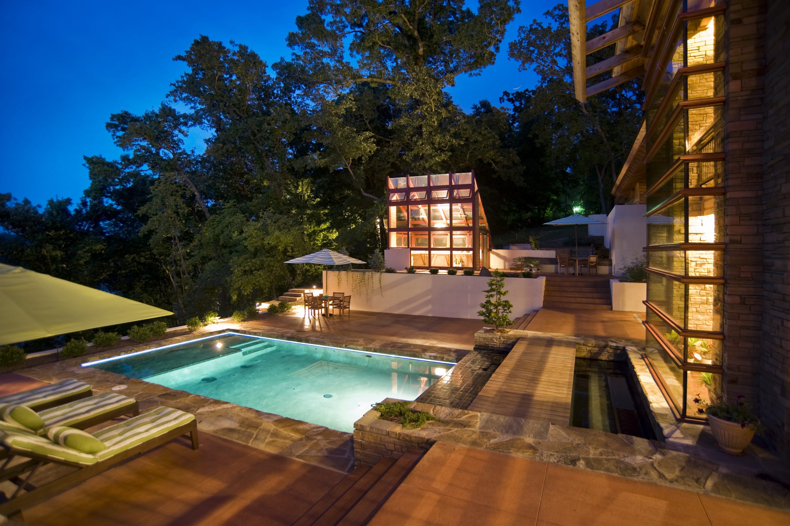 The home is sited on a steeply sloped and wooded ozark lot at the tail end of a lake that resembles a lizard. The single family residence is designed as a series of separate but harmonious events including a Guest Suite, Swimming Pool, Garden House and Boat Pavilion.