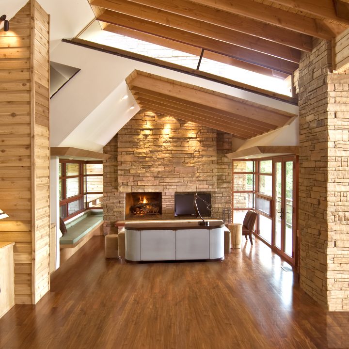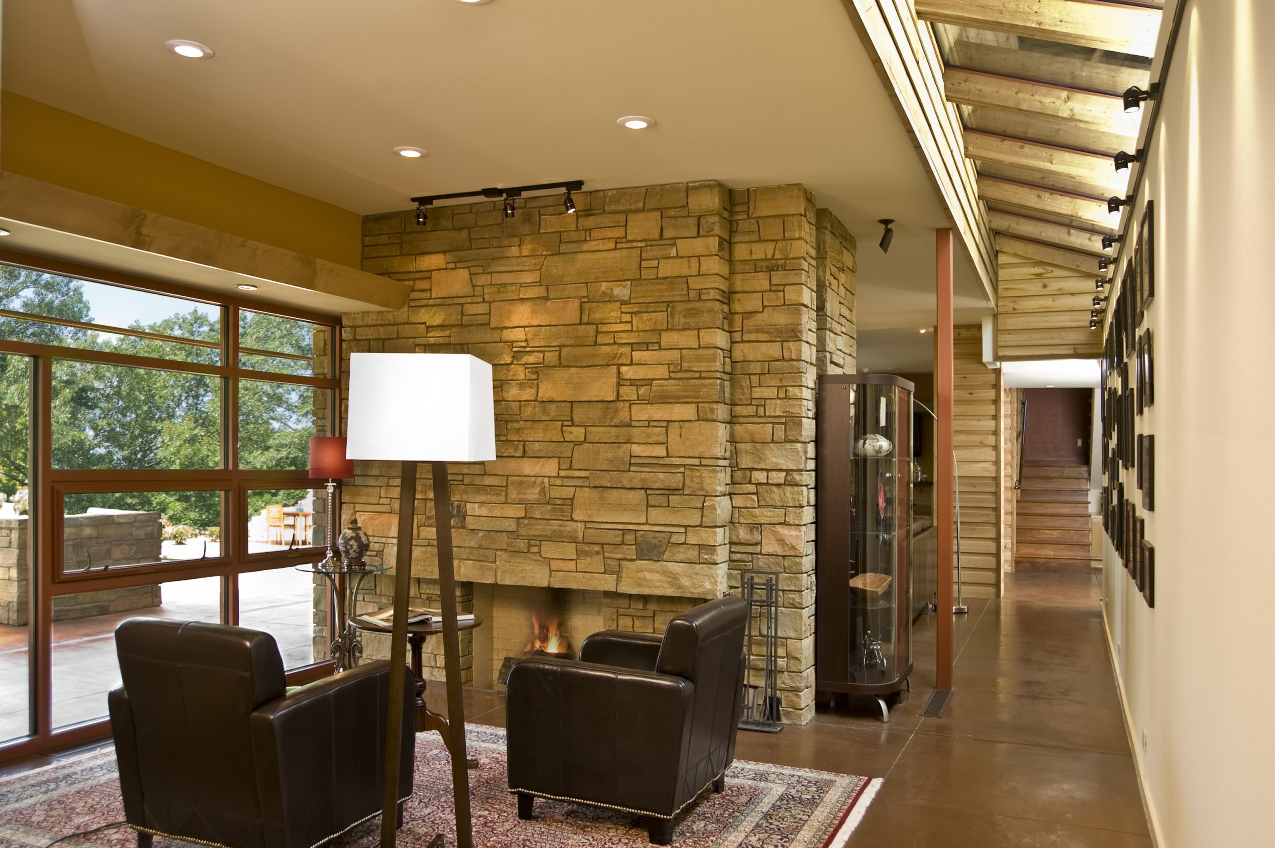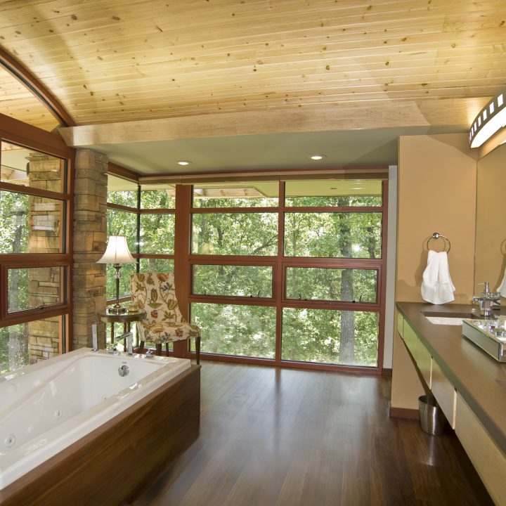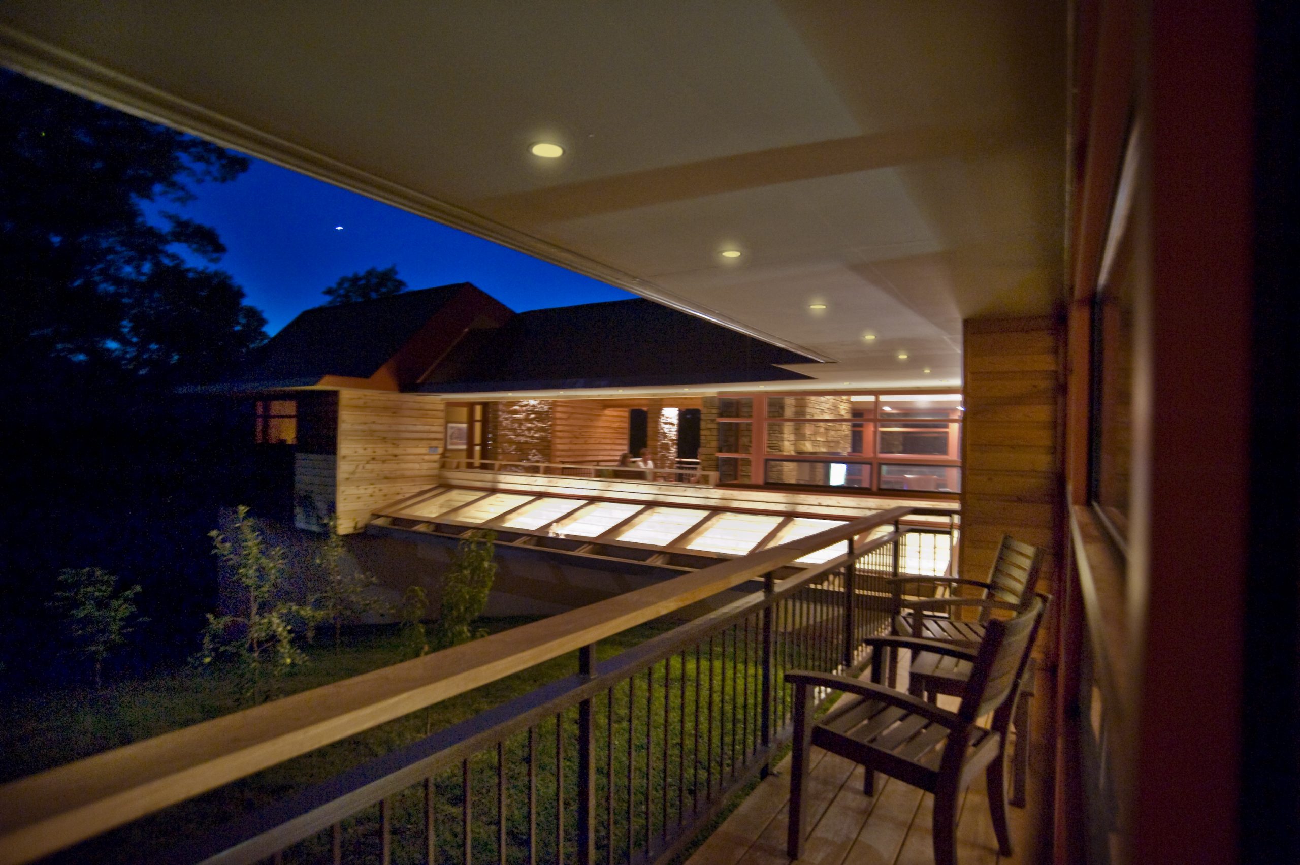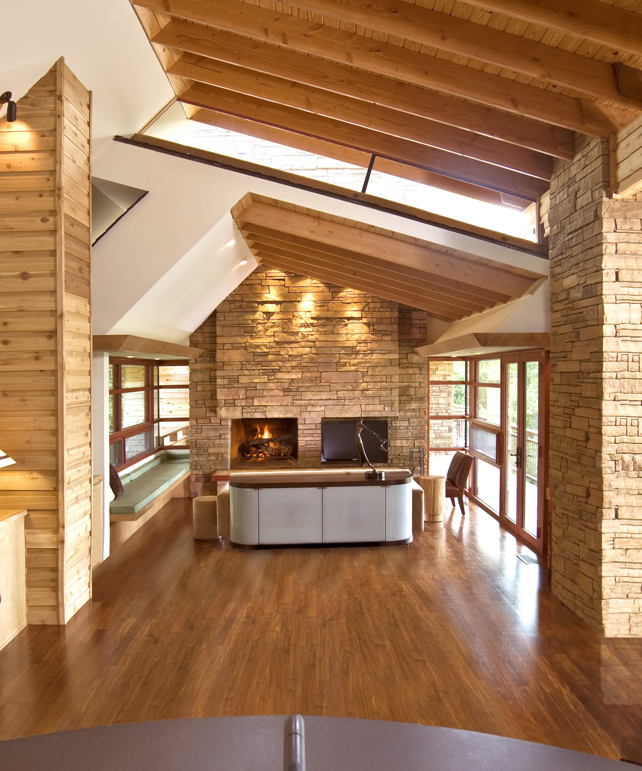 The home is sited on a steeply sloped and wooded ozark lot at the tail end of a lake that resembles a lizard. The single family residence is designed as a series of separate but harmonious events including a Guest Suite, Swimming Pool, Garden House and Boat Pavilion.