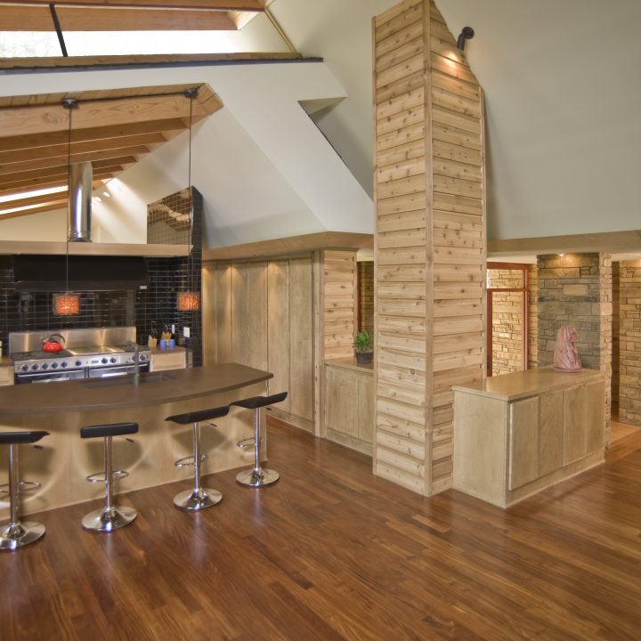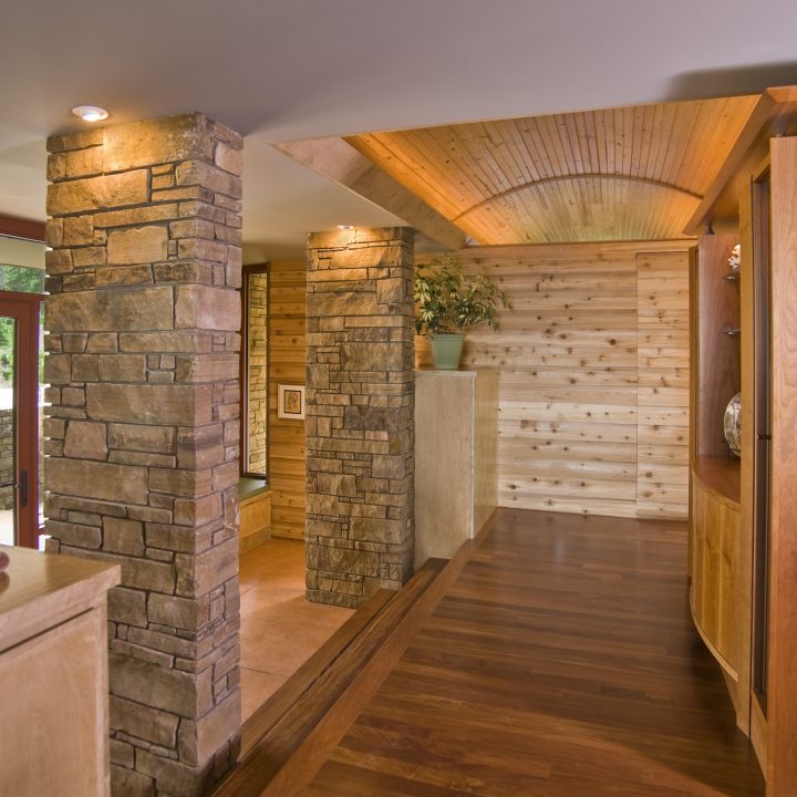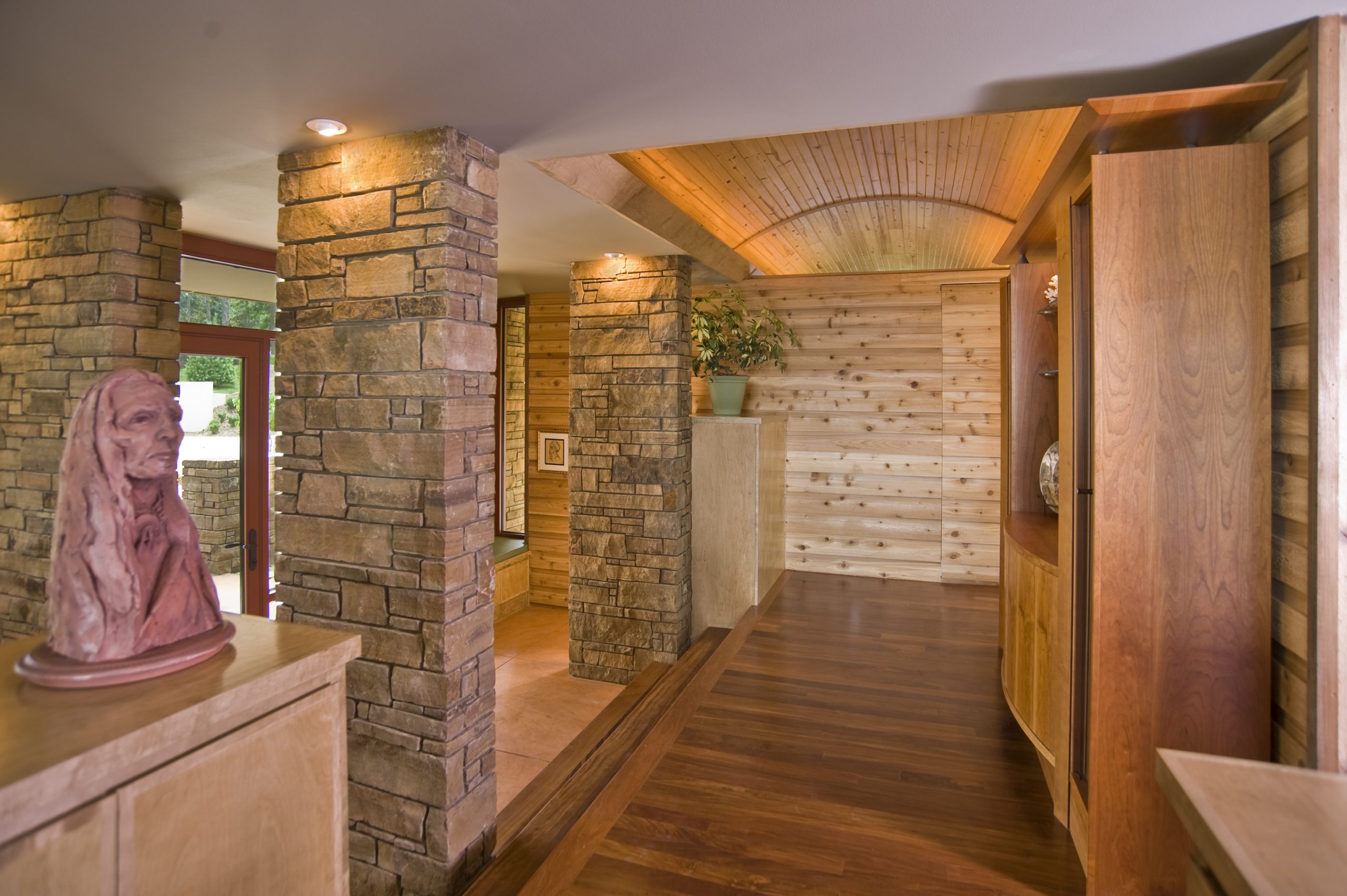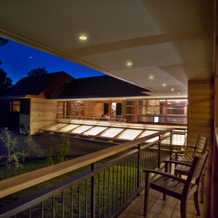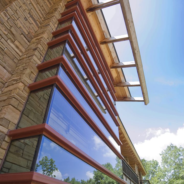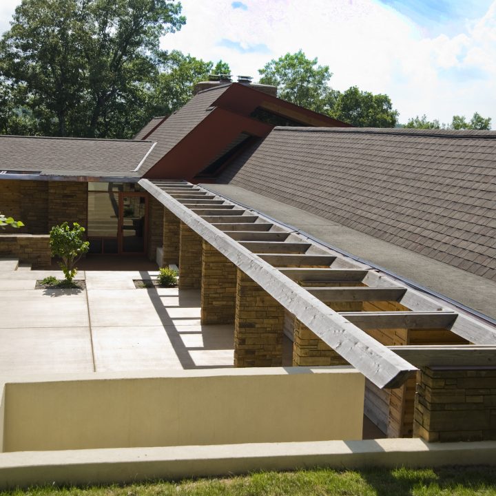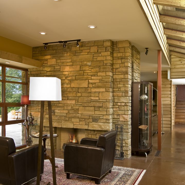 The home is sited on a steeply sloped and wooded ozark lot at the tail end of a lake that resembles a lizard. The single family residence is designed as a series of separate but harmonious events including a Guest Suite, Swimming Pool, Garden House and Boat Pavilion.